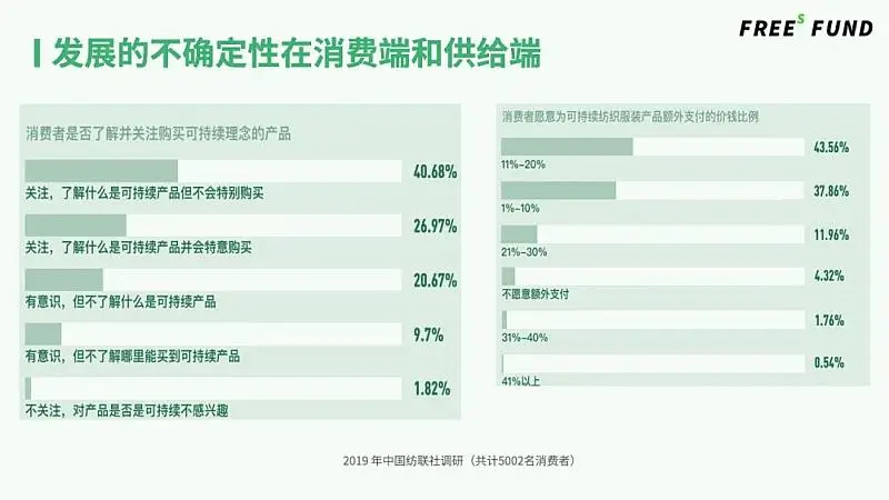 已經(jīng)有一些比較樂觀的現(xiàn)象表明,越來越多的消費(fèi)者愿意為可持續(xù)材料、功能性材料買單。根據(jù)中國紡聯(lián)社2019年的調(diào)研,在受訪的5002名消費(fèi)者中,超過40%的消費(fèi)者愿意為可持續(xù)紡織服裝產(chǎn)品付出10%至20%的溢價(jià)。