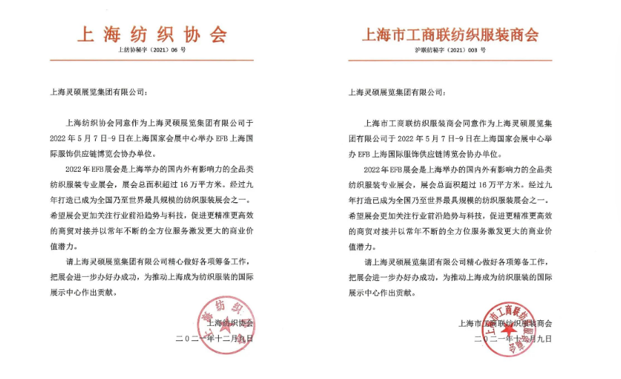 上海紡織協會與上海市工商業聯合會紡織服裝商會成立至今,已吸引了上百家上海及長三角地區民營紡織服裝企業的加入。作為2022年EFB服飾供應鏈展的協辦單位,是推動上海紡織服裝企業轉型發展的專業服務機構和推動上海時尚之都建設的重要平臺,共同促進EFB服飾供應鏈展搭建與中國紡織行業資源對接的橋梁,更好地集聚行業信息,推進紡織業的健康發展。
