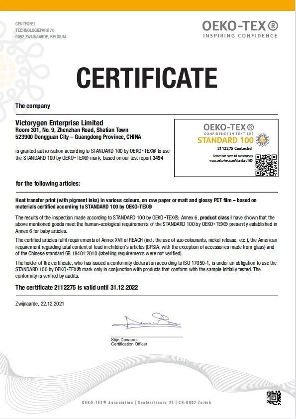 成祥企業的服裝燙畫產業獲得了了ISO9001、OEKO-TEX STANDARD 100、SMETA SEDEX等權威資質認證